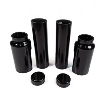 212mm long. Gloss black powder coated CNC machined aluminum covers. Covers the full front fork from bottom to top of the upper triple tree. Includes aluminum fork tube caps, upper fork covers and smooth black aluminum lower fork covers. Transforms the complete front end to a massive Black-Out muscle bike look. Compatible with stock and custom fenders. Installs with set-screws. All required hardware is included. Note: For 07-11 V-Rod models The Factory used 3 different lengths. It is therefore required to measure the distance between upper and lower triple tree clamps to be able to order the correct kit.