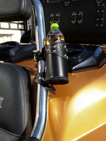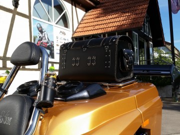 Makkelijk te monteren aan je motor of trike via 2 leren riempjes.