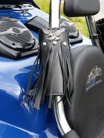 Makkelijk te monteren aan je motor of trike via 2 leren riempjes.